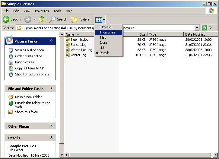 - If thumbnails are not being displayed then select Thumbnails using the Views button: