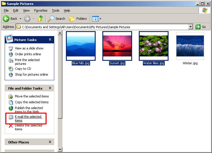 - Next select the files you want to be resized and click the E-mail the selected items option from the File and Folder Tasks menu: