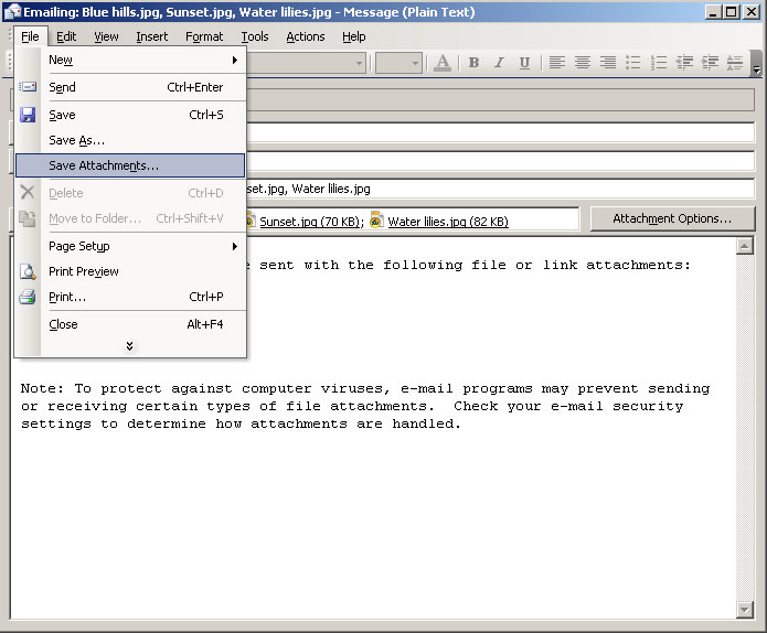 - An email window will then open showing the images as attachments. Click the File menu and select Save Attachments:
